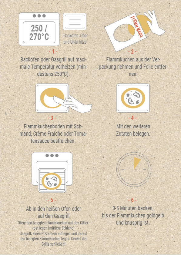 5. Ab in den heißen Ofen oder auf den Gasgrill. Ofen: den belegten Flammkuchen auf den Gitterrost legen (mittlere Schiene) Gasgrill: einen Pizzastein auflegen und darauf den belegten Flammkuchen legen. Deckel des Grills schließen!